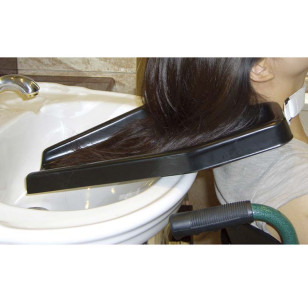 Consta de un lavacabezas en plástico abs resistente y ligero, con soporte en los hombros que se sujeta mediante una cinta al cuello.