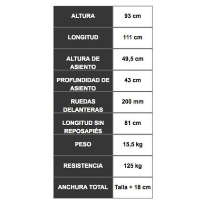 El modelo DUO dsipone de ruedas macizas delanteras de 200 y ruedas macizas traseras de 600 Y 250 mm.