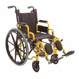 La silla de ruedas para niños o infantil con estructura de acero pintado en amarillo.