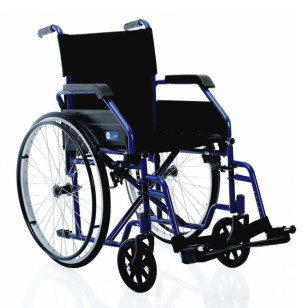 Silla de ruedas de acero muy resistente con acabado pintado azul y tapicería de nylon acolchado en color negro.